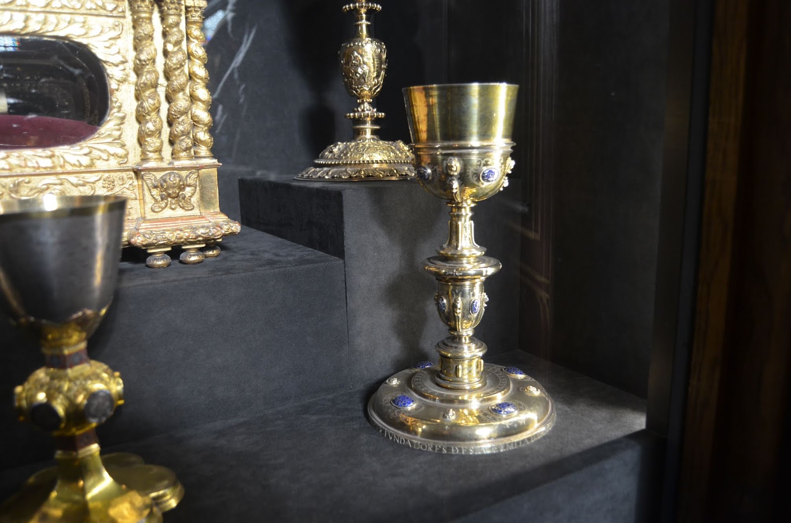 algunos cálices y copones de procedencia española y el relicario exterior de la